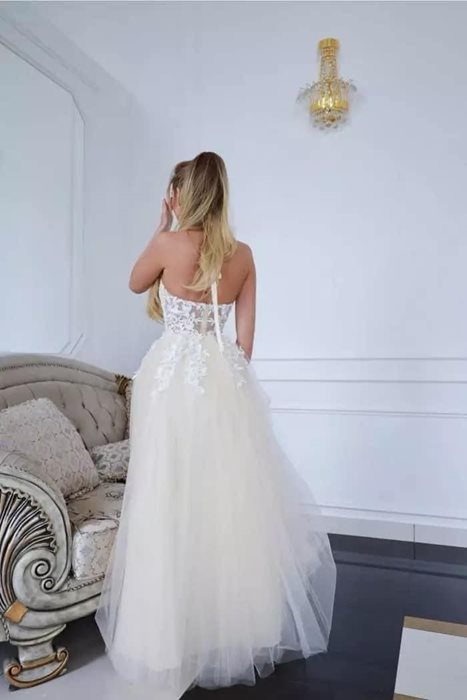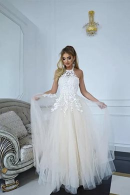 Powiadomienie o dostępności: Długa sukienka princeska hafty wiązanie szyja beż