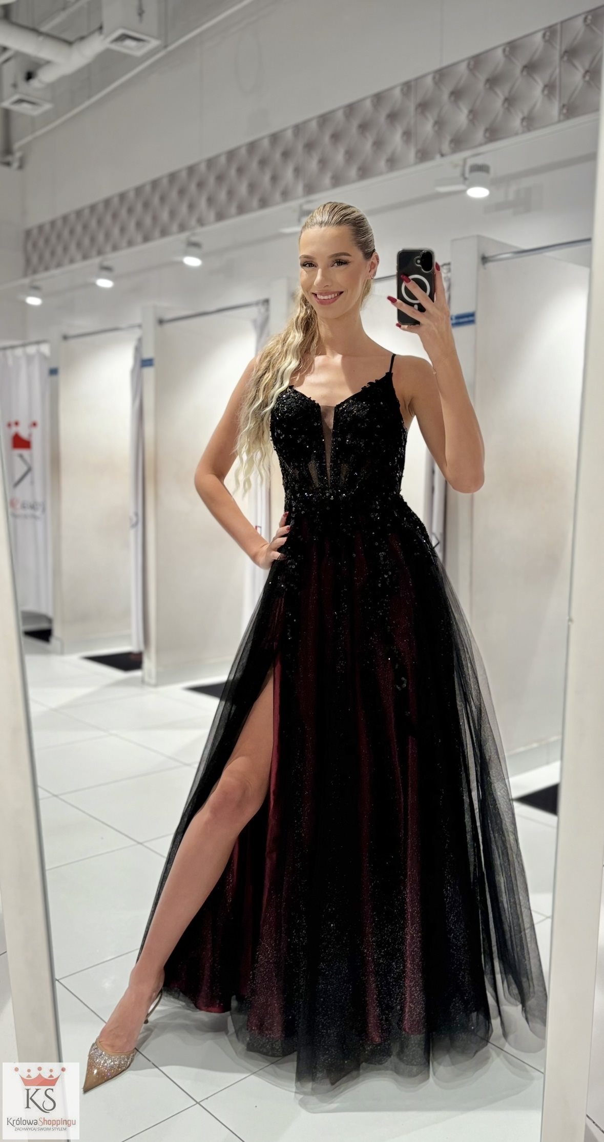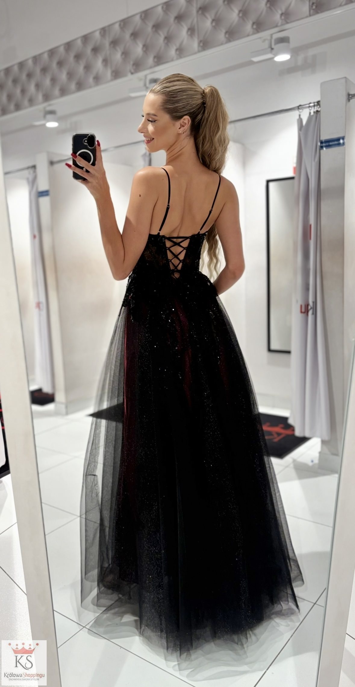 Powiadomienie o dostępności: Sukienka długa brokat gorset czerń/bordo