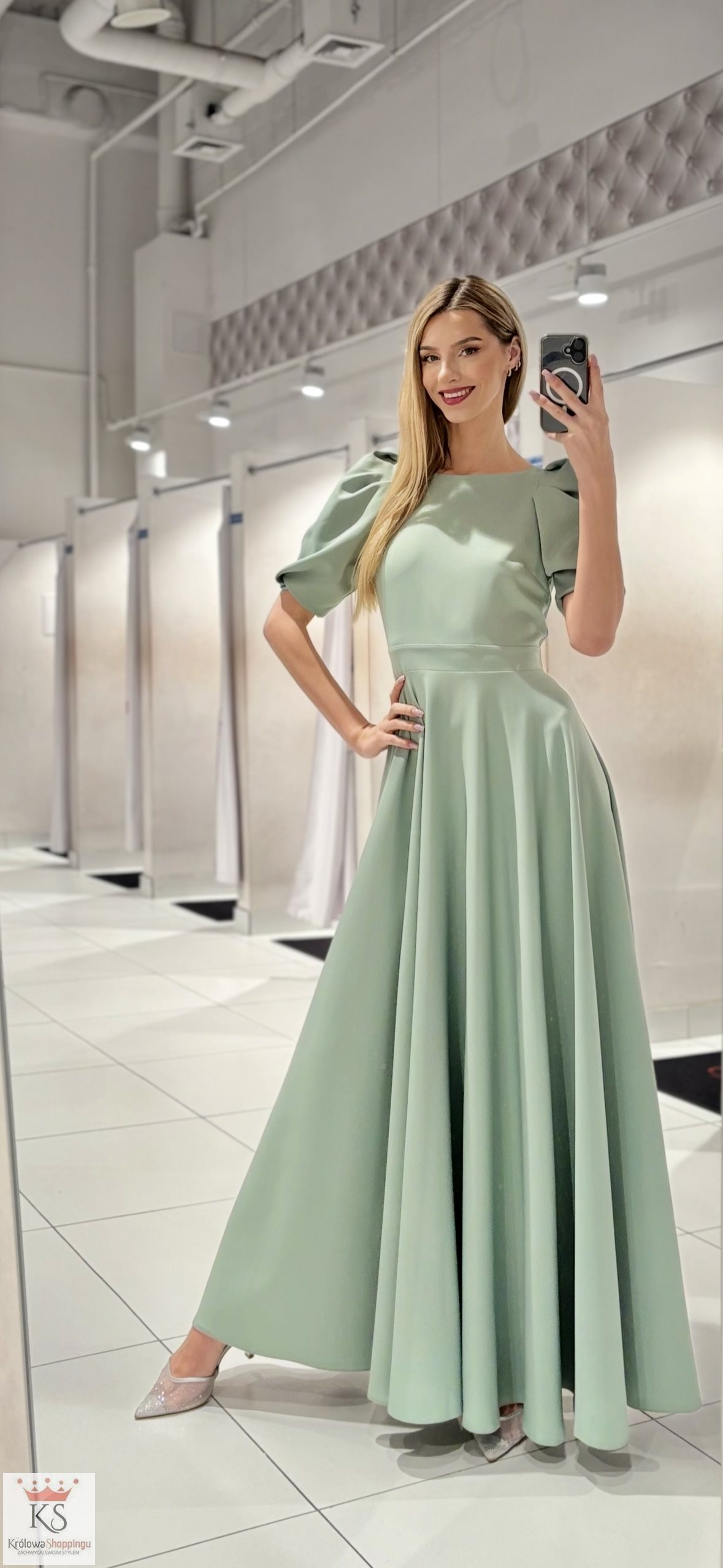 Powiadomienie o dostępności: Sukienka długa bufiaste rękawki szałwia