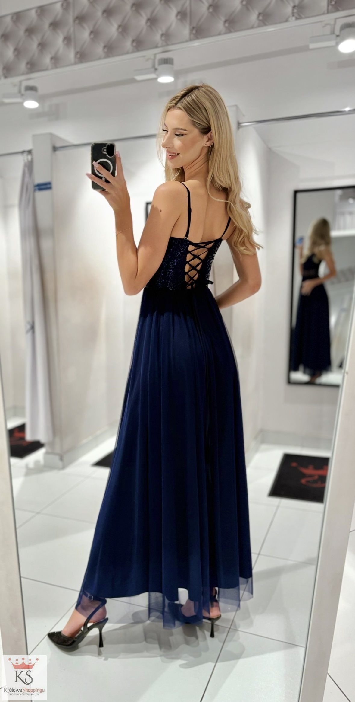 Powiadomienie o dostępności: Sukienka długa góra zdobiona tiul granat