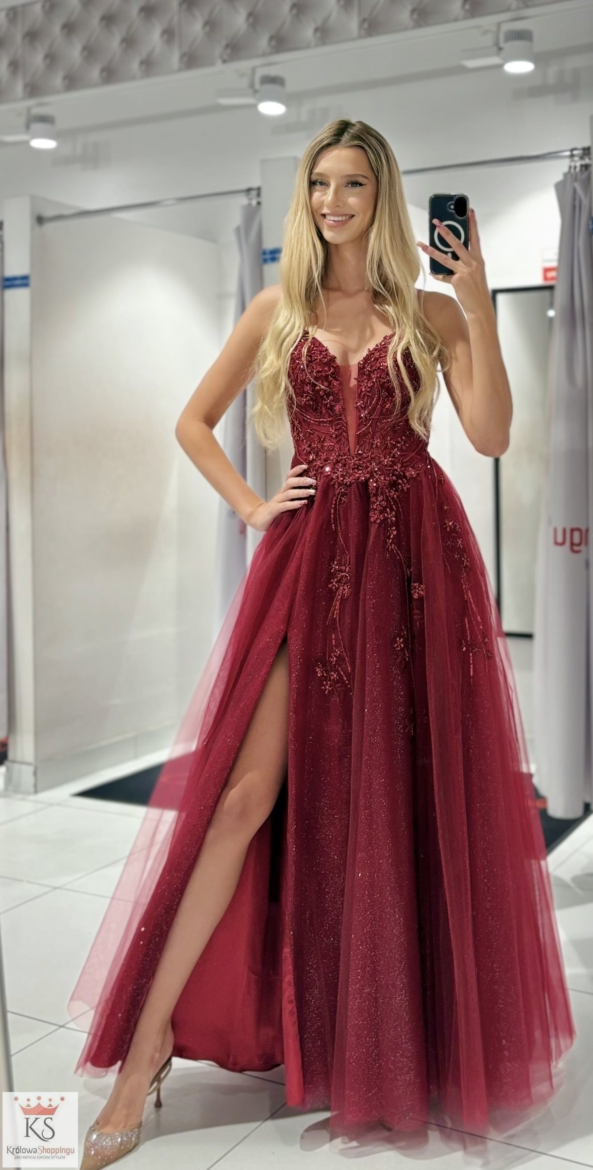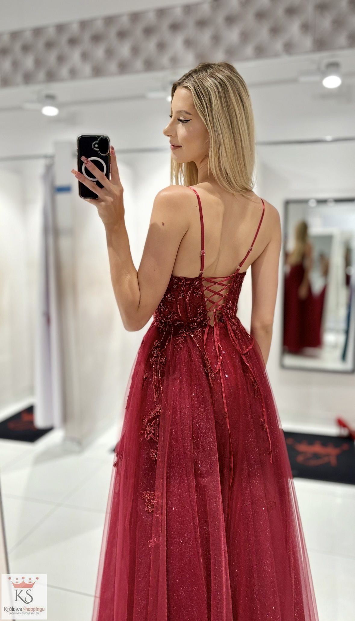 Powiadomienie o dostępności: Sukienka długa gorset kwiaty haft brokat bordo