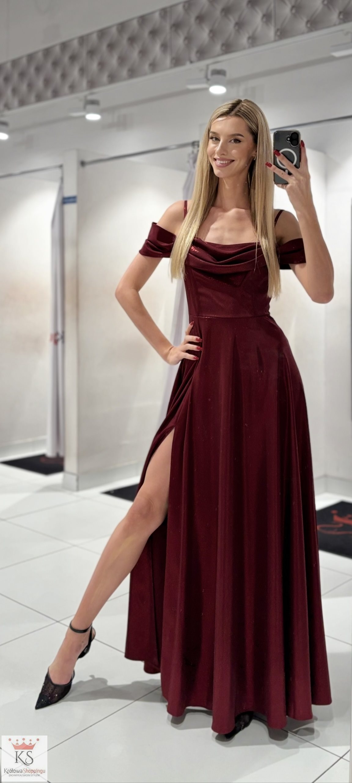 Powiadomienie o dostępności: Sukienka długa hiszpanka dekolt woda błysk bordo