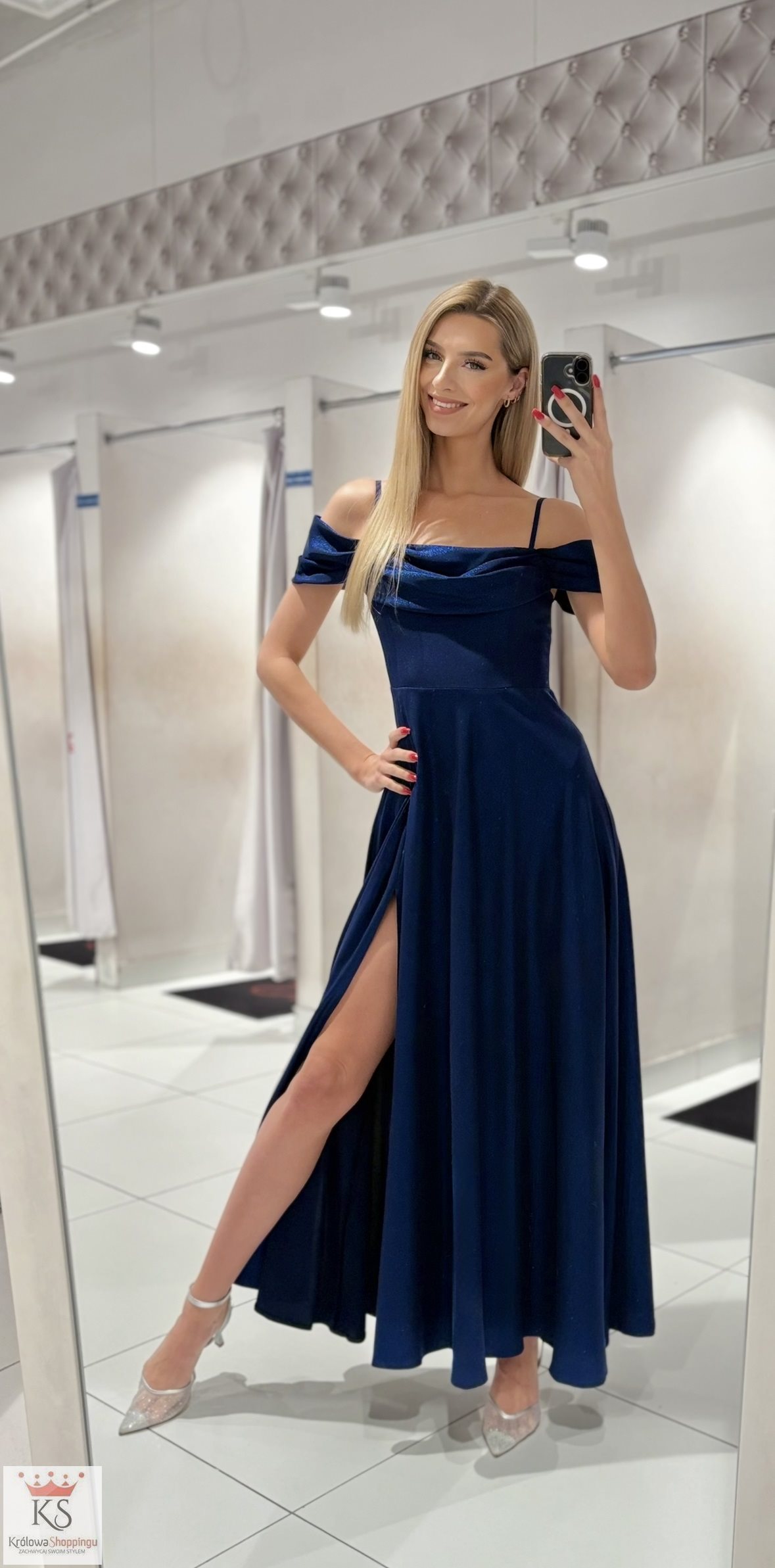Powiadomienie o dostępności: Sukienka długa hiszpanka dekolt woda błysk granat