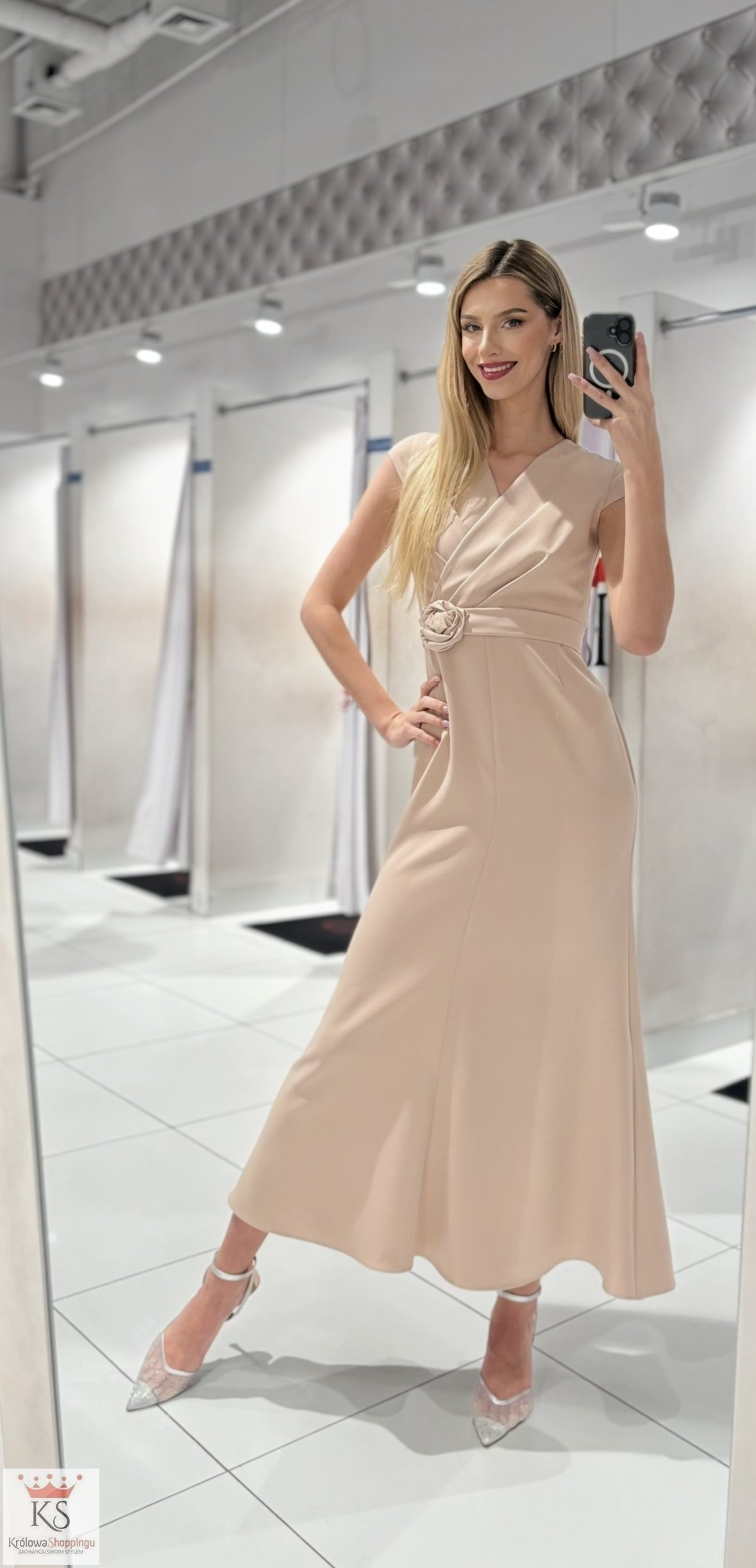 Powiadomienie o dostępności: Sukienka długa klasyczna z rękawkiem pasek beż