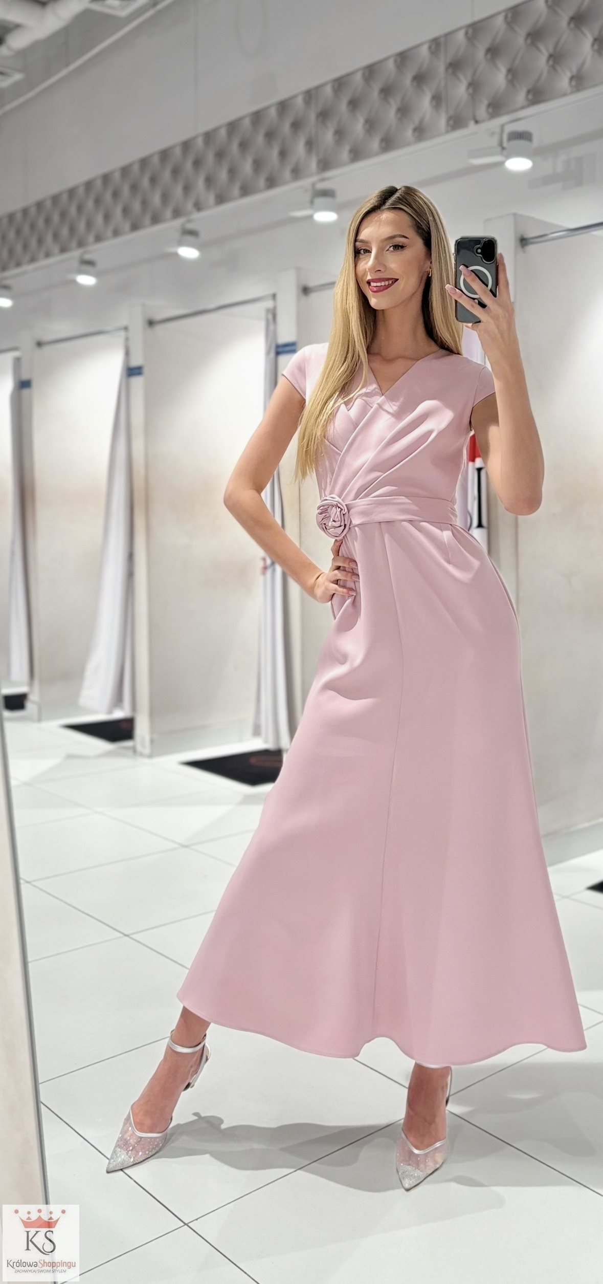 Sukienka długa klasyczna z rękawkiem pasek p. róż