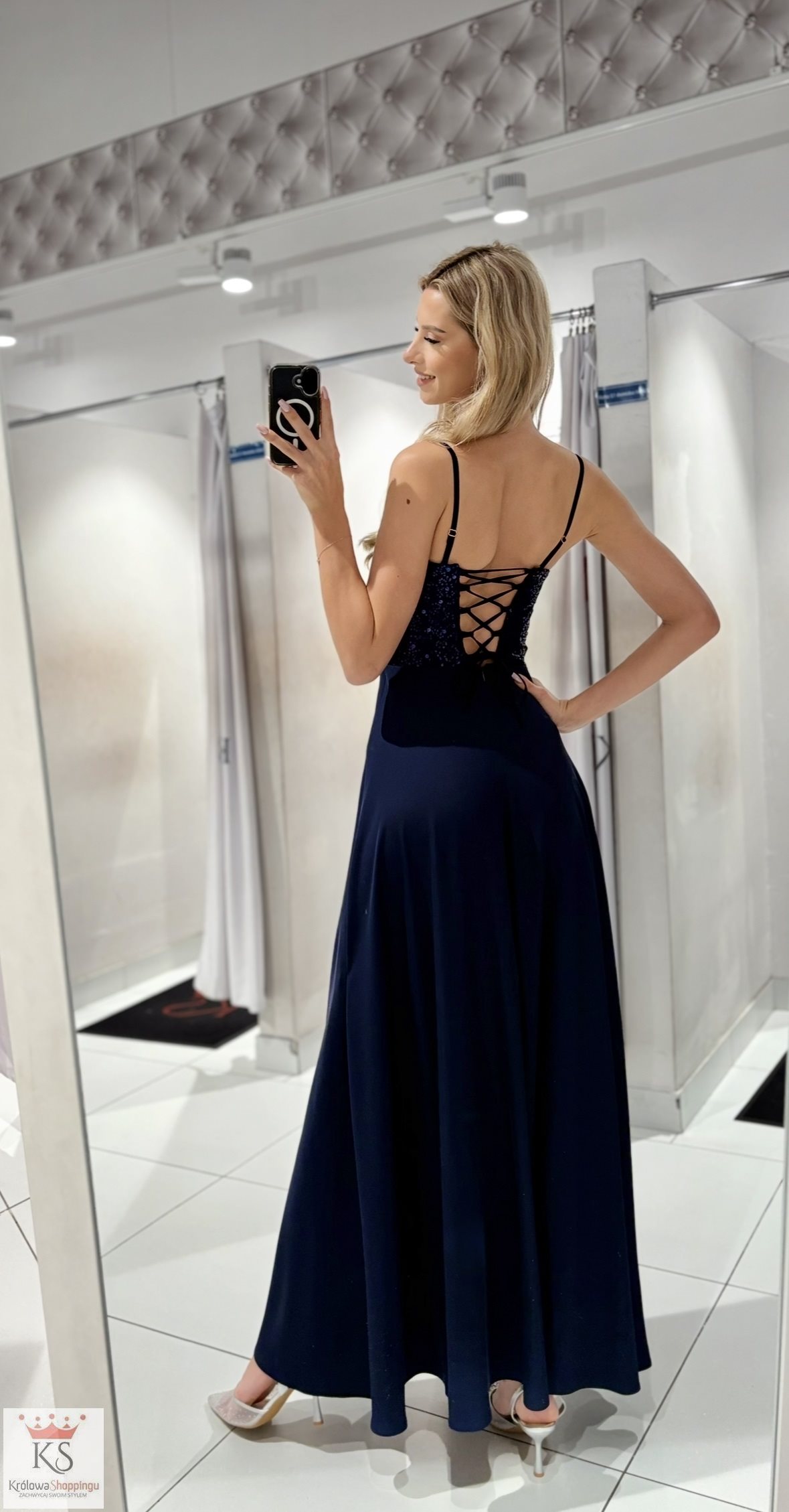 Powiadomienie o dostępności: Sukienka długa klosz gorset woda cekin granat