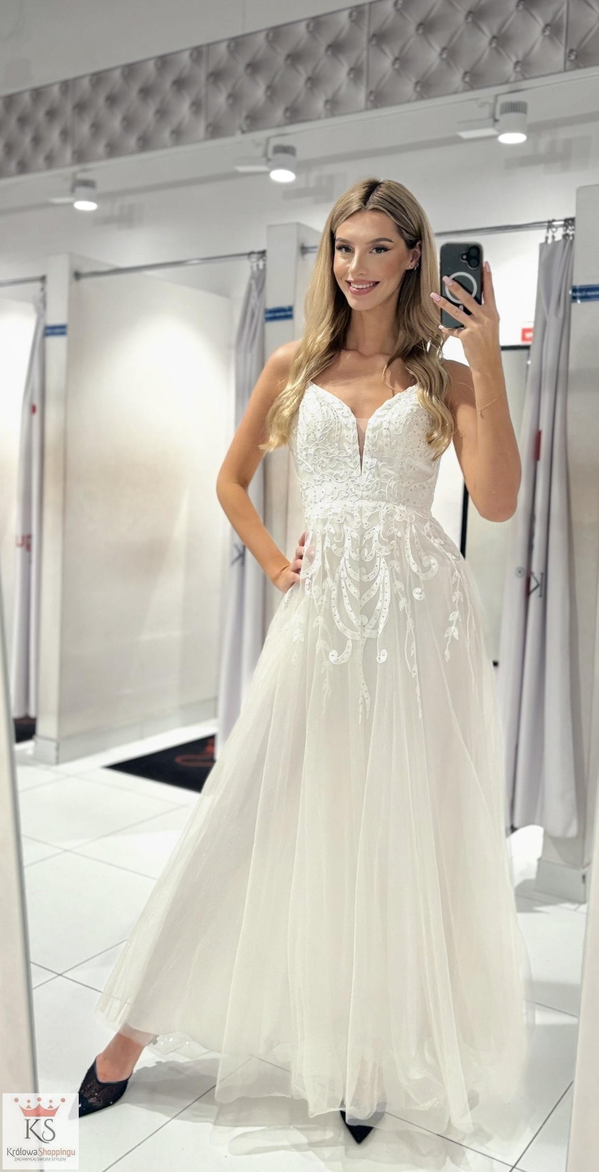Powiadomienie o dostępności: Sukienka długa koronka dół tiul błyszczący biały