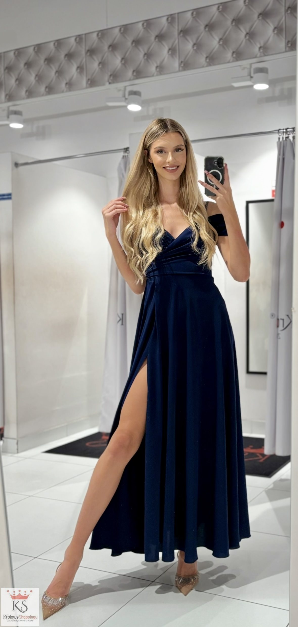 Powiadomienie o dostępności: Sukienka długa opadające ramiona gładka granat