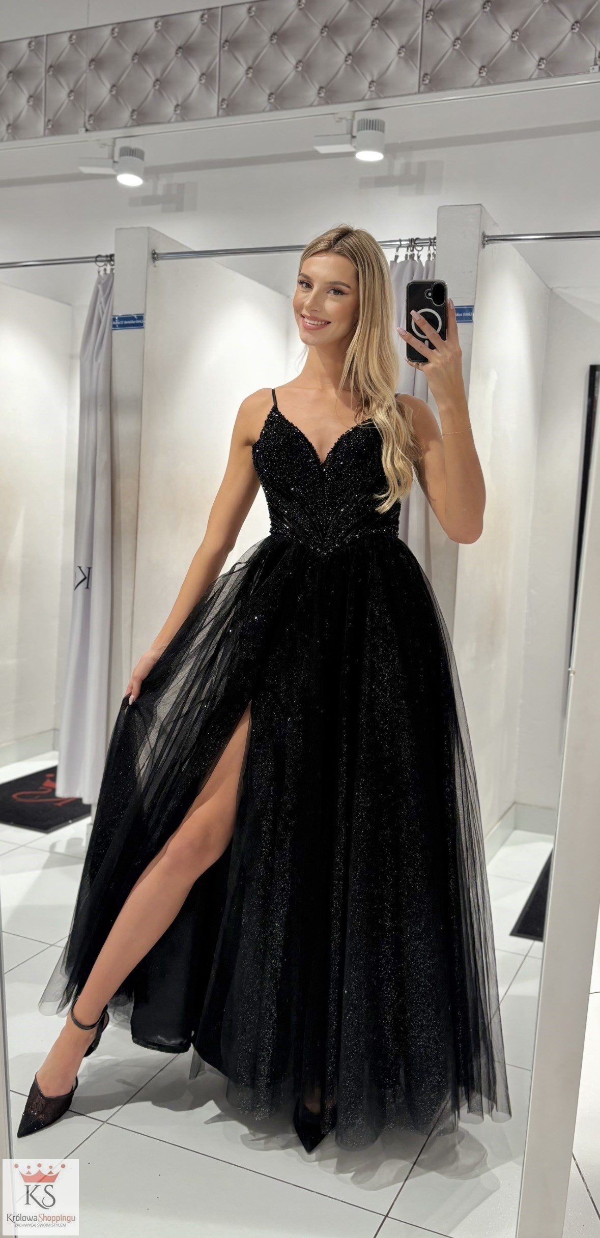 Sukienka długa perełki gorset wiązanie tiul czerń