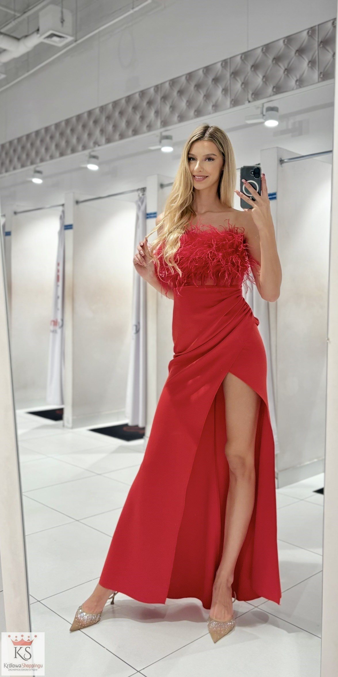 Powiadomienie o dostępności: Sukienka długa rybka gorset siateczka pióra czerw.