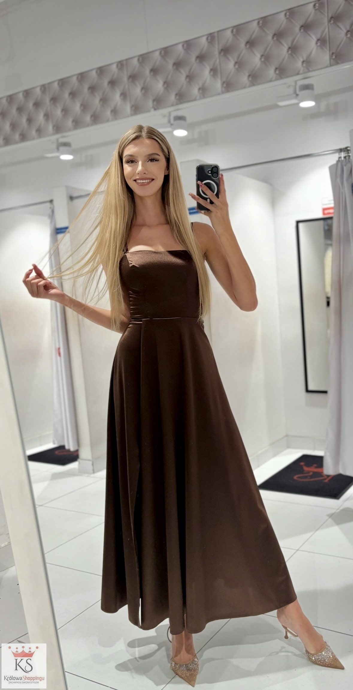 Powiadomienie o dostępności: Sukienka długa satyna wiązane plecy czekolada