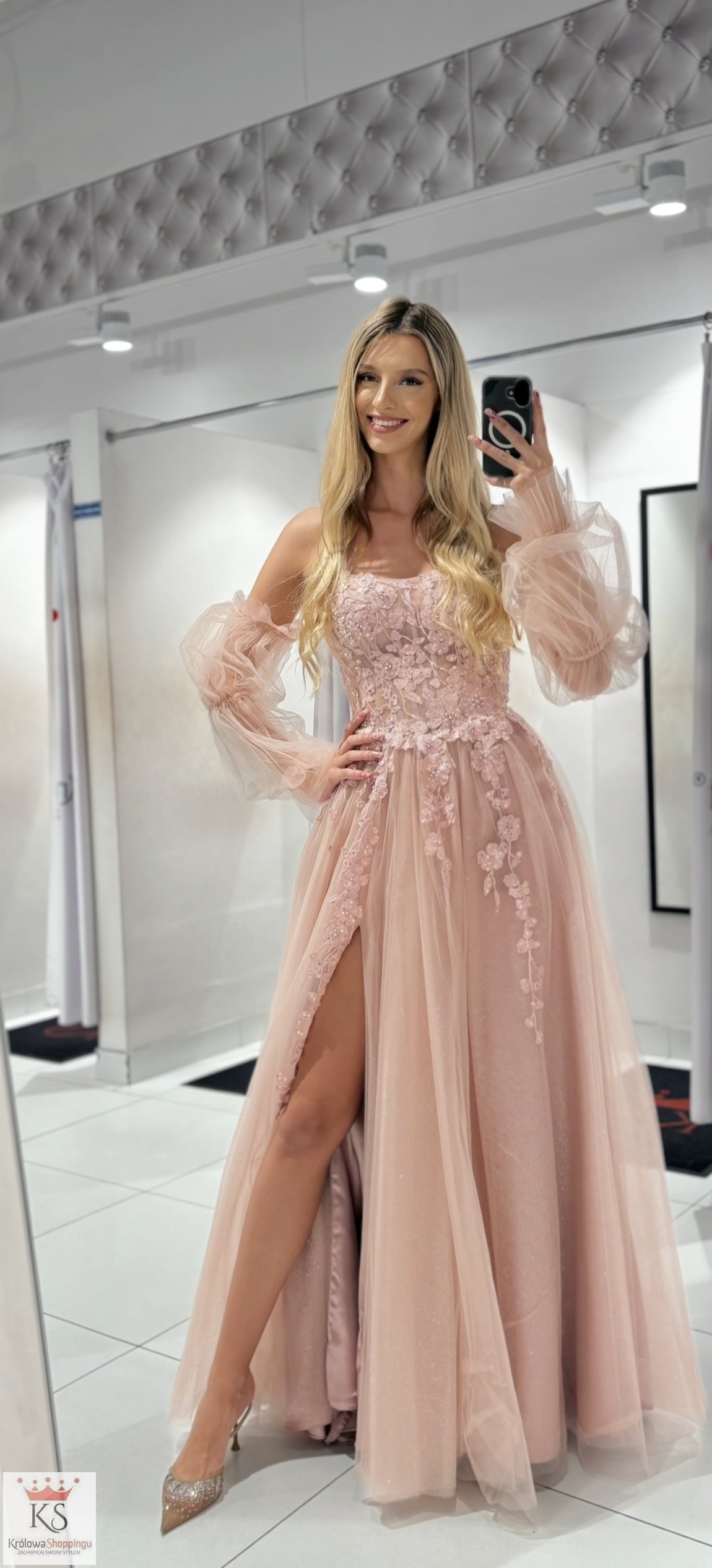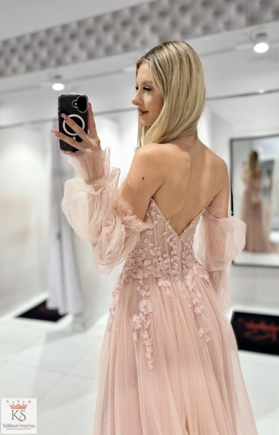 Sukienka długa tiul koronka brokat rękawy p.róż