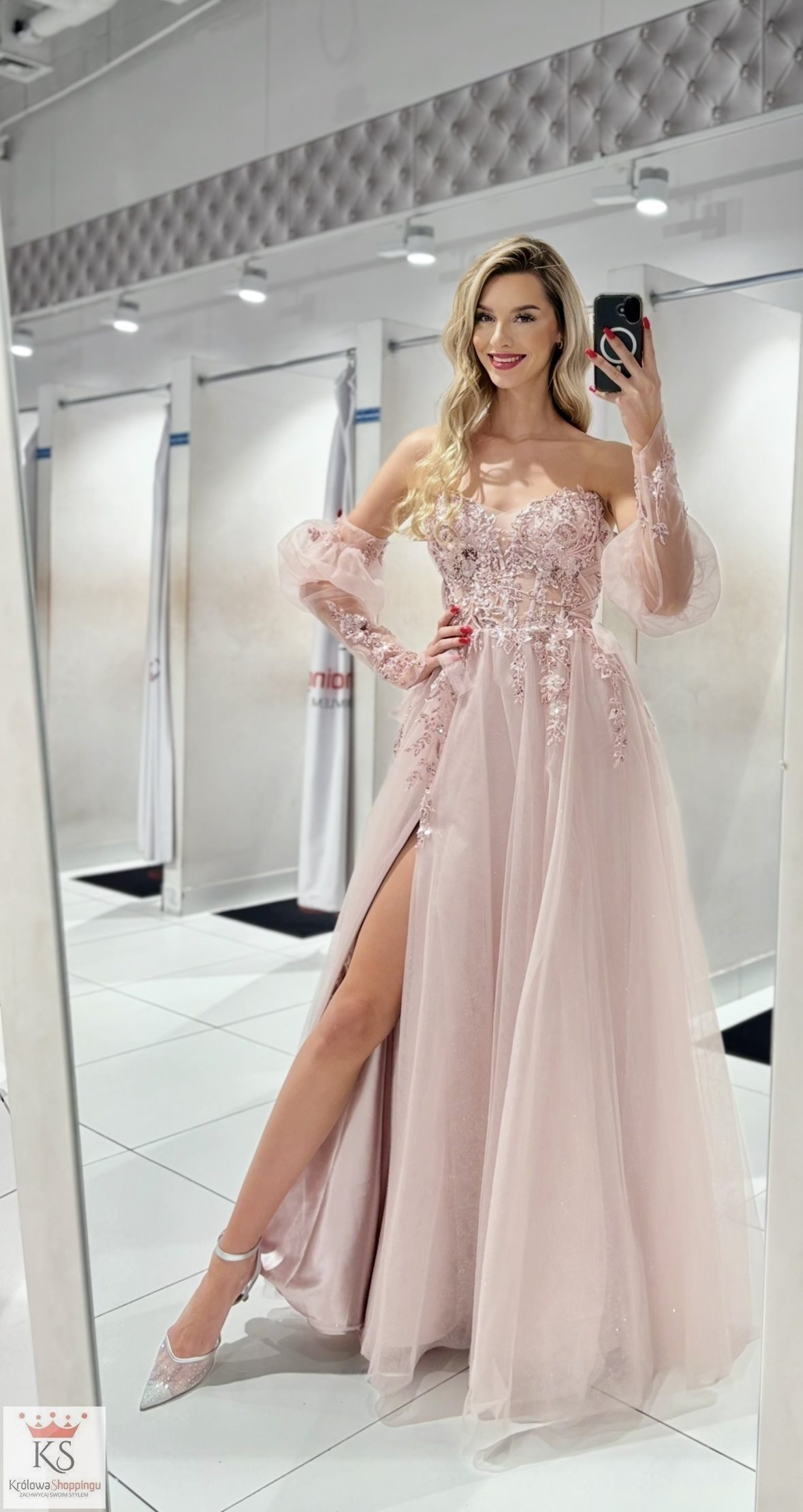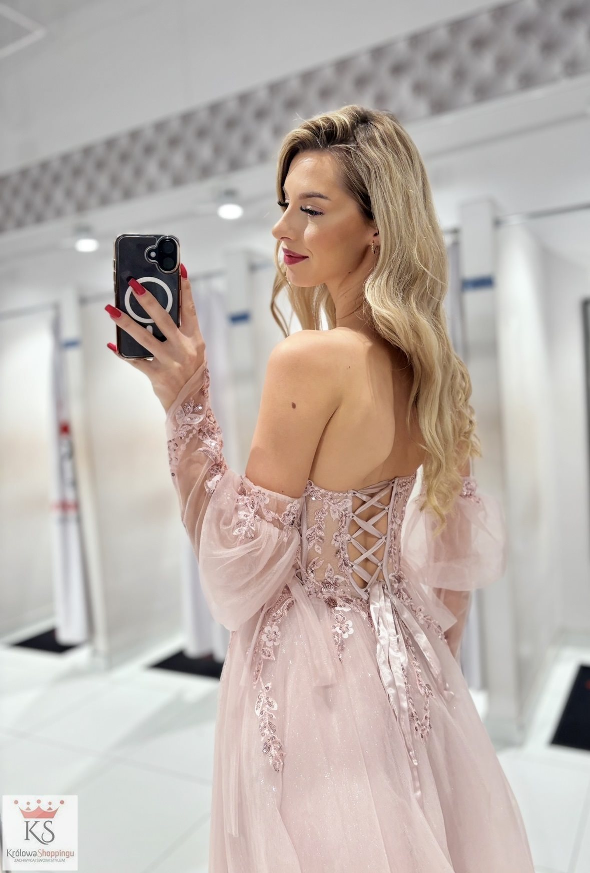 Powiadomienie o dostępności: Sukienka długa tiul rękawek gorset puder róż