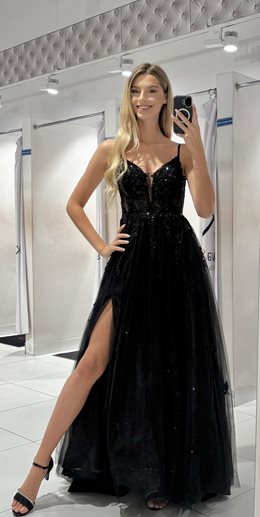 Powiadomienie o dostępności: Sukienka długa tiul wiązany tył dekolt V czerń