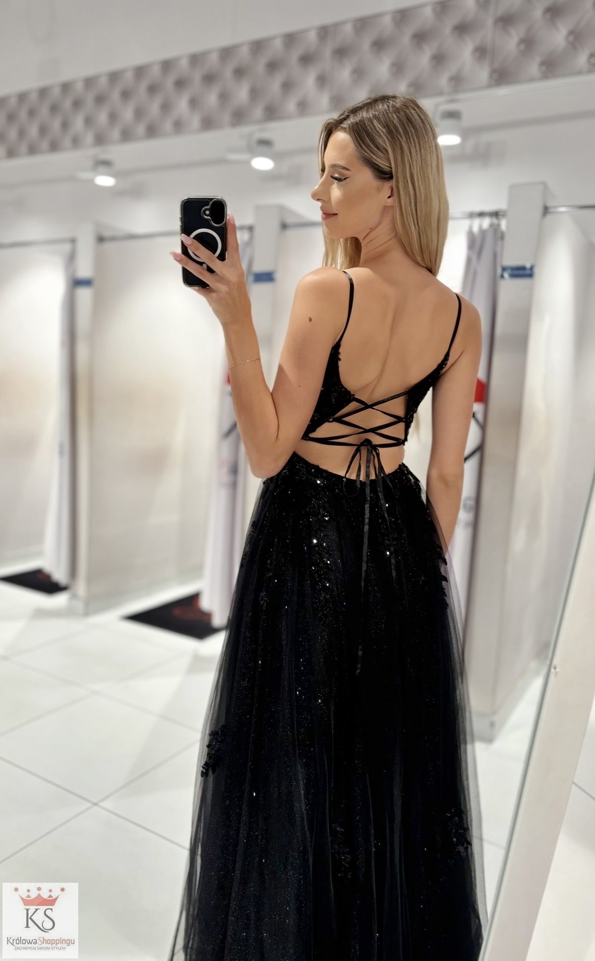 Sukienka długa tiul wiązany tył dekolt V czerń