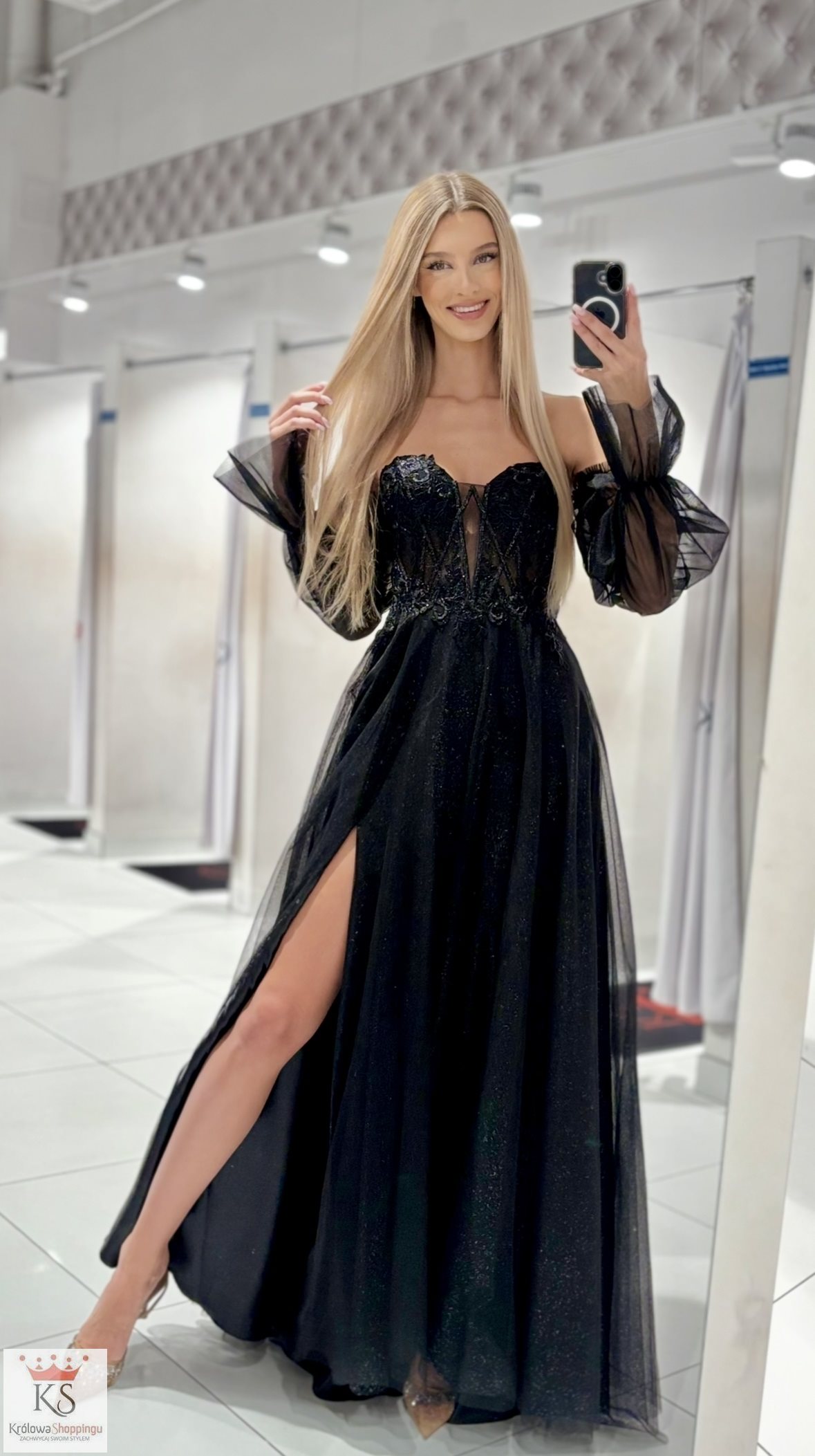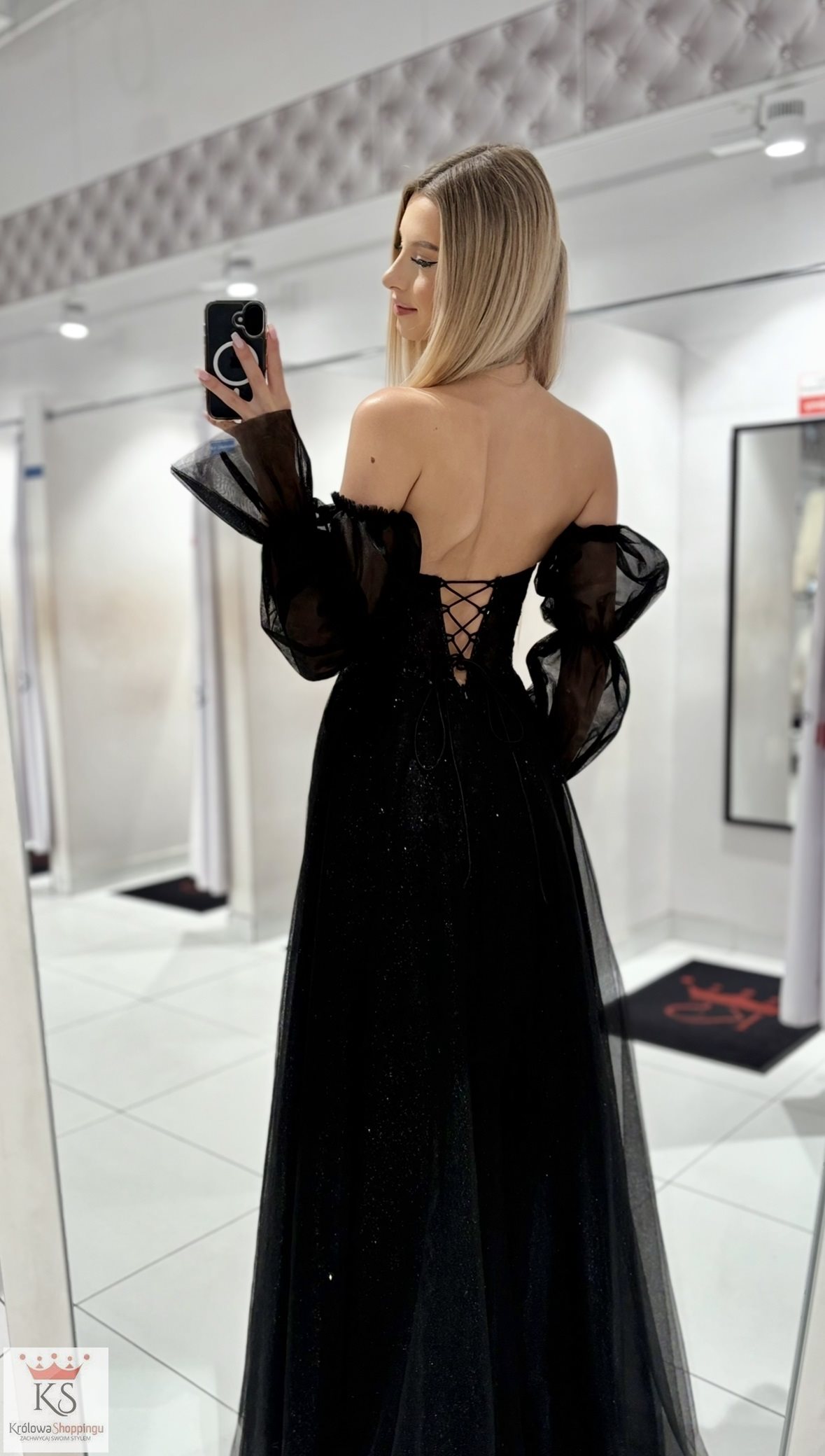 Powiadomienie o dostępności: Sukienka długa tiulowa gorset zdobiony rękaw czerń