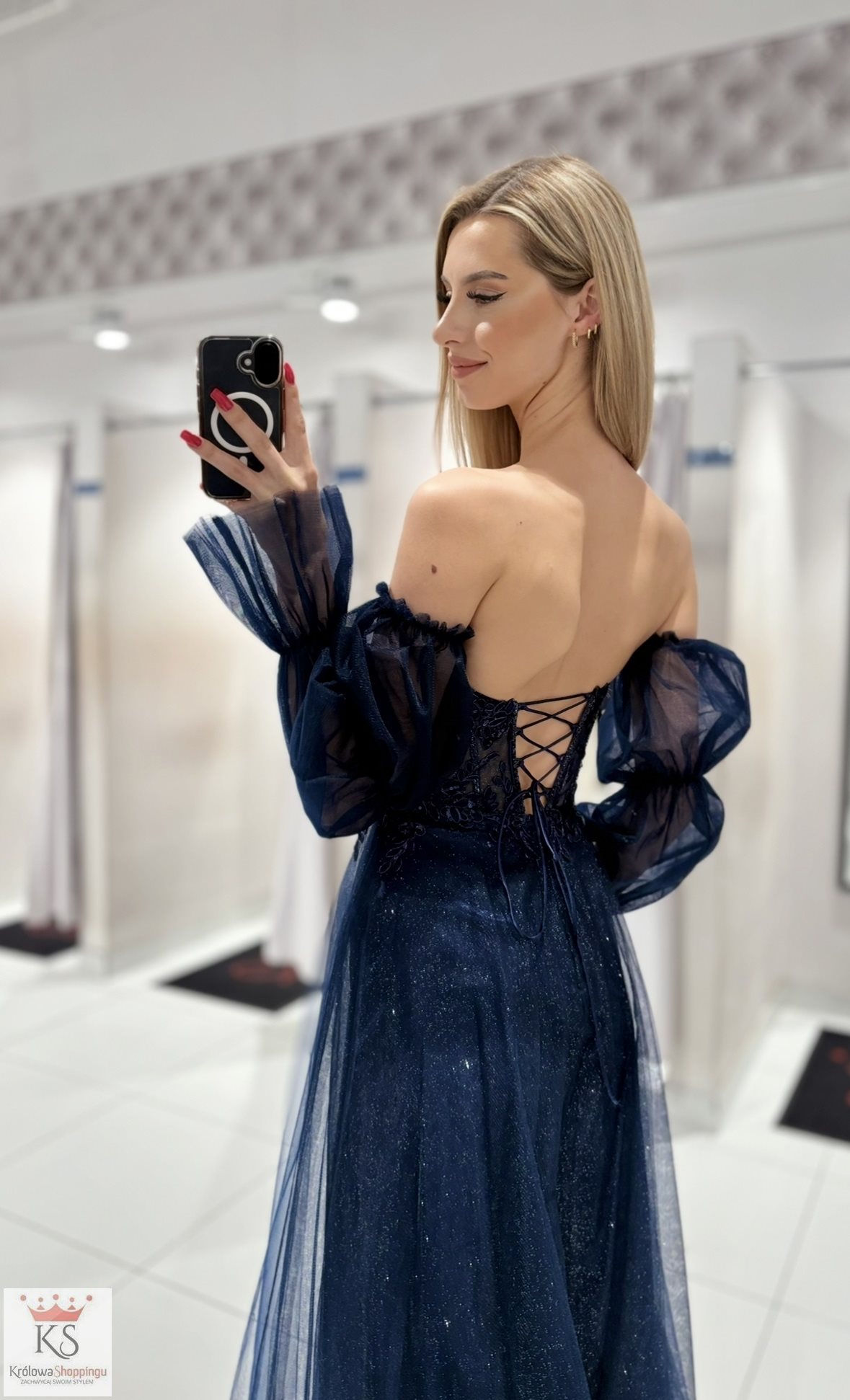 Sukienka długa tiulowa gorset zdobiony rękaw granat