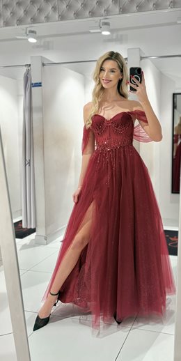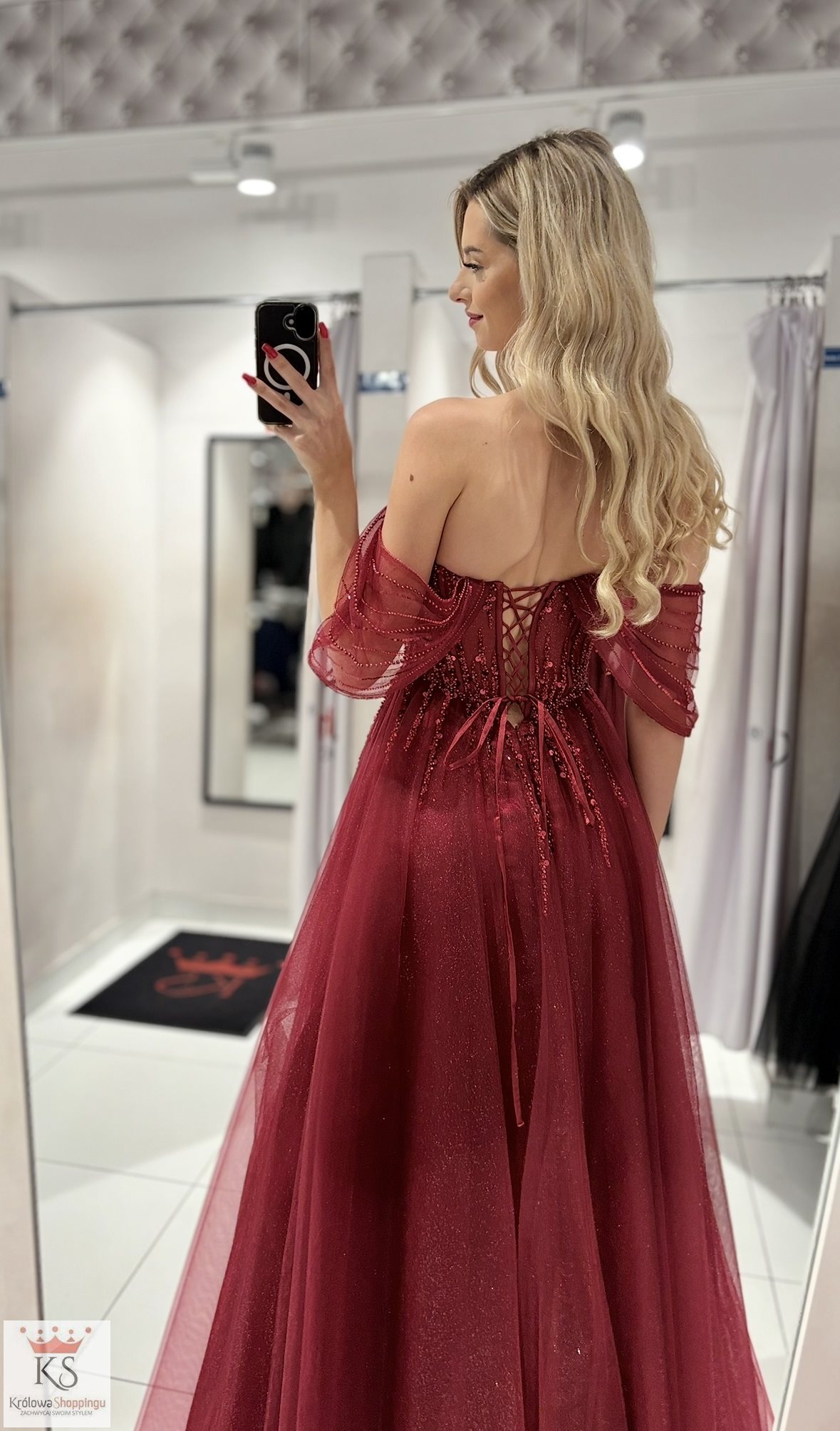 Powiadomienie o dostępności: Sukienka długa tiulowa opadające rękawki bordo