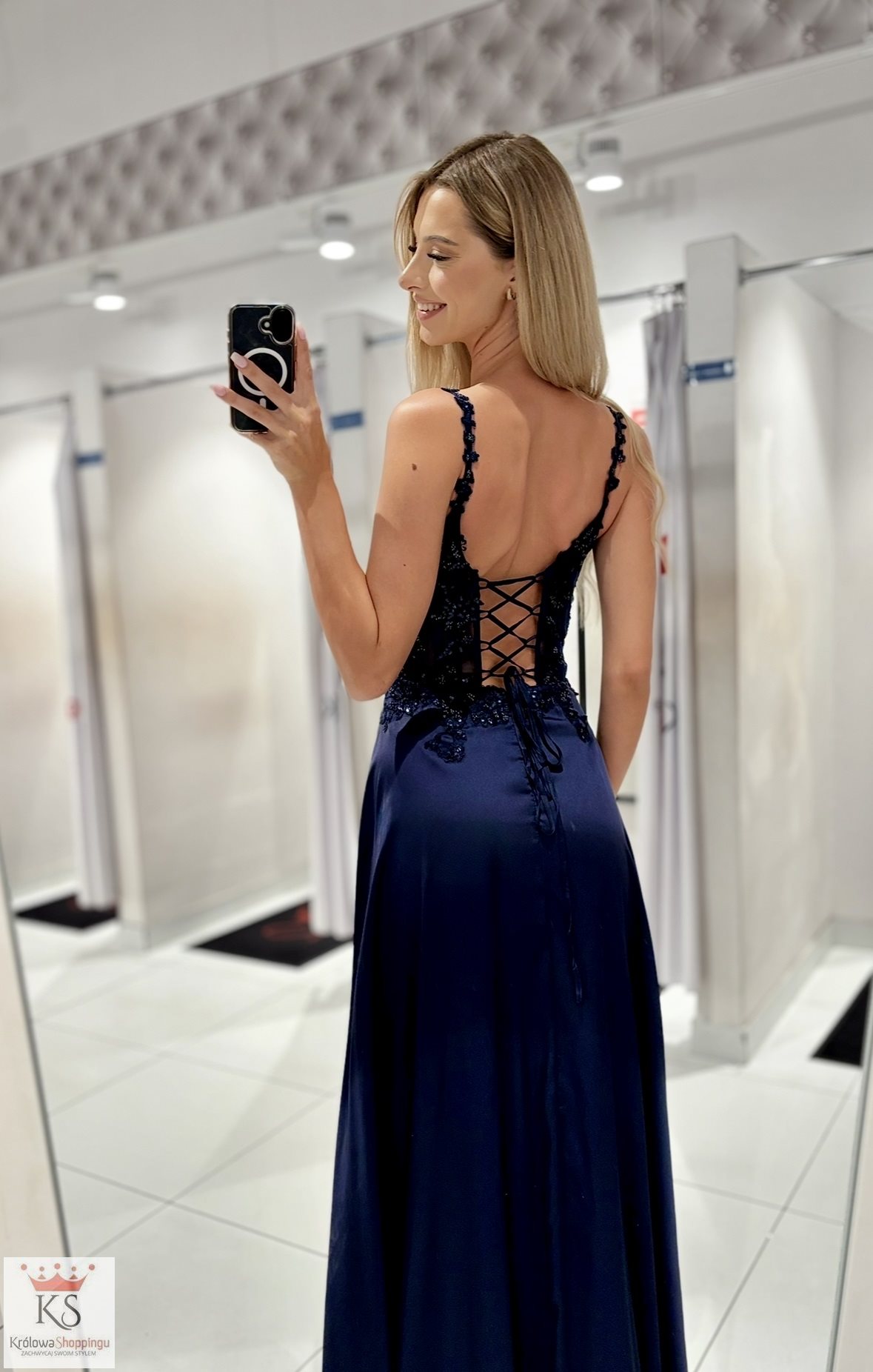 Powiadomienie o dostępności: Sukienka długa zdobiona góra dół satyna granat