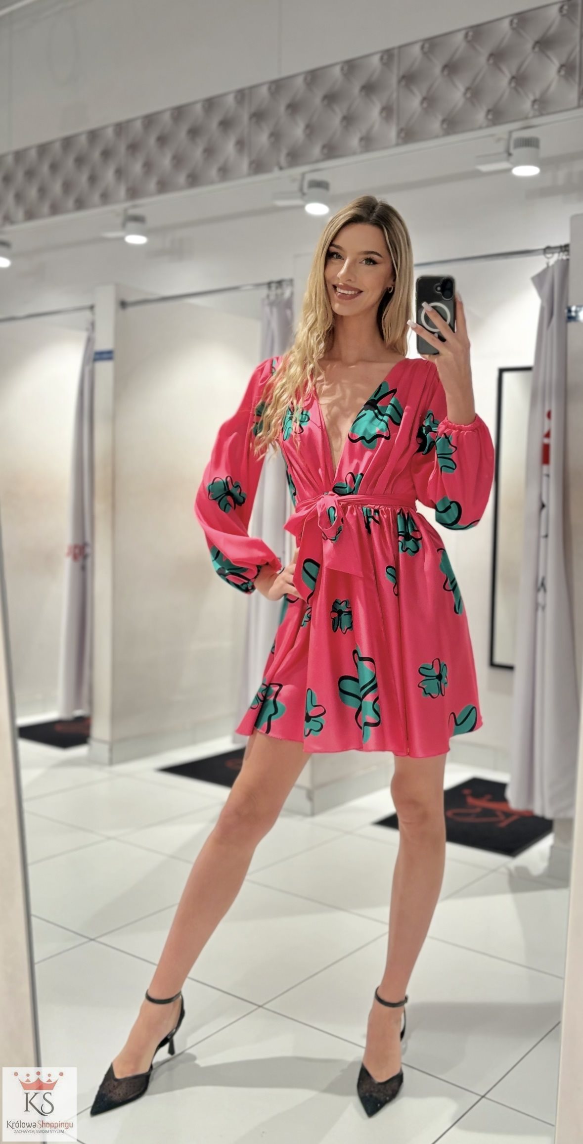 Powiadomienie o dostępności: Sukienka krótka z ściągaczem w talii róż/zieleń
