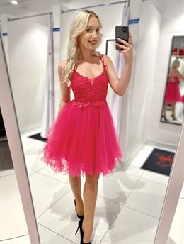 Powiadomienie o dostępności: Sukienka krótka z tiulem i wiązanym tyłem fuksja