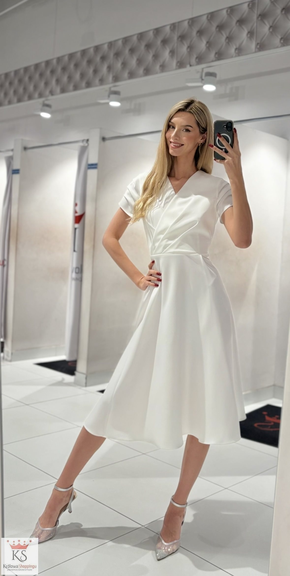 Sukienka midi marszczony rękawek zakładka biel