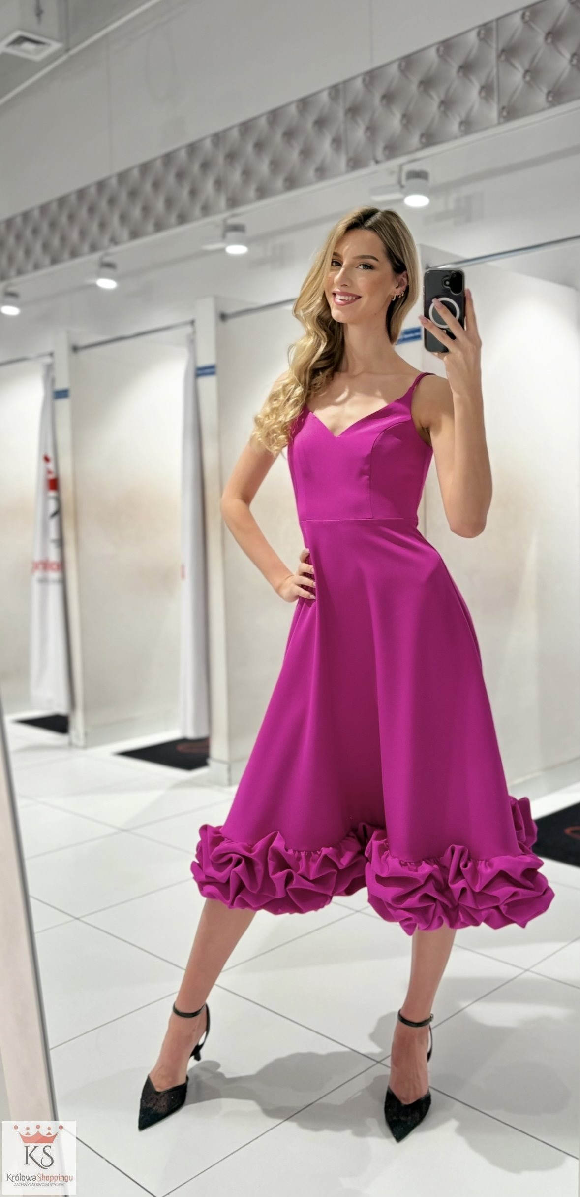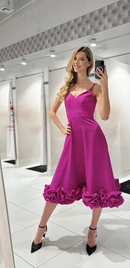 Sukienka midi ramiączka dół klosz falbana fuksja