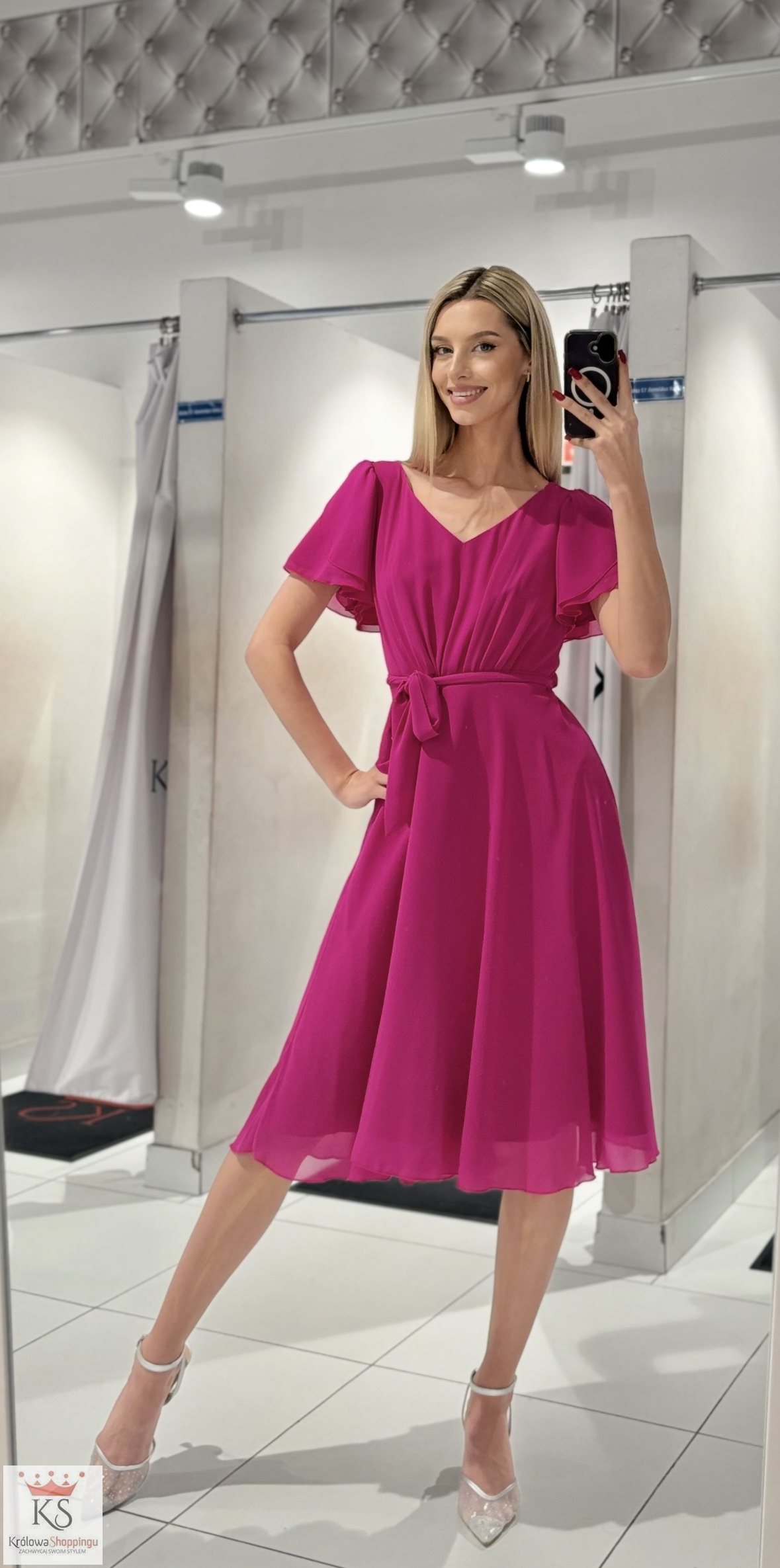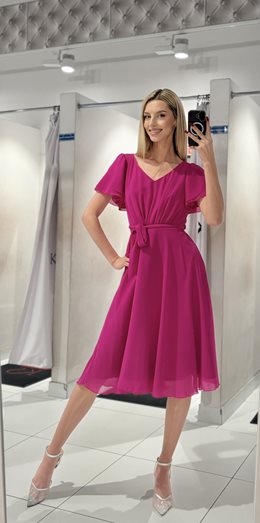 Sukienka midi szyfon rękawek falbanka fuksja
